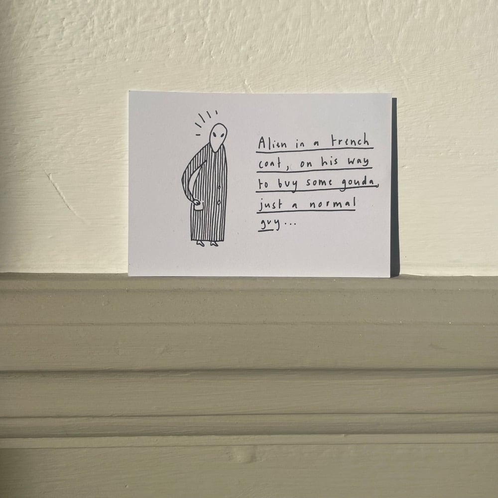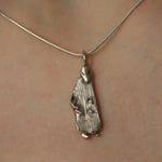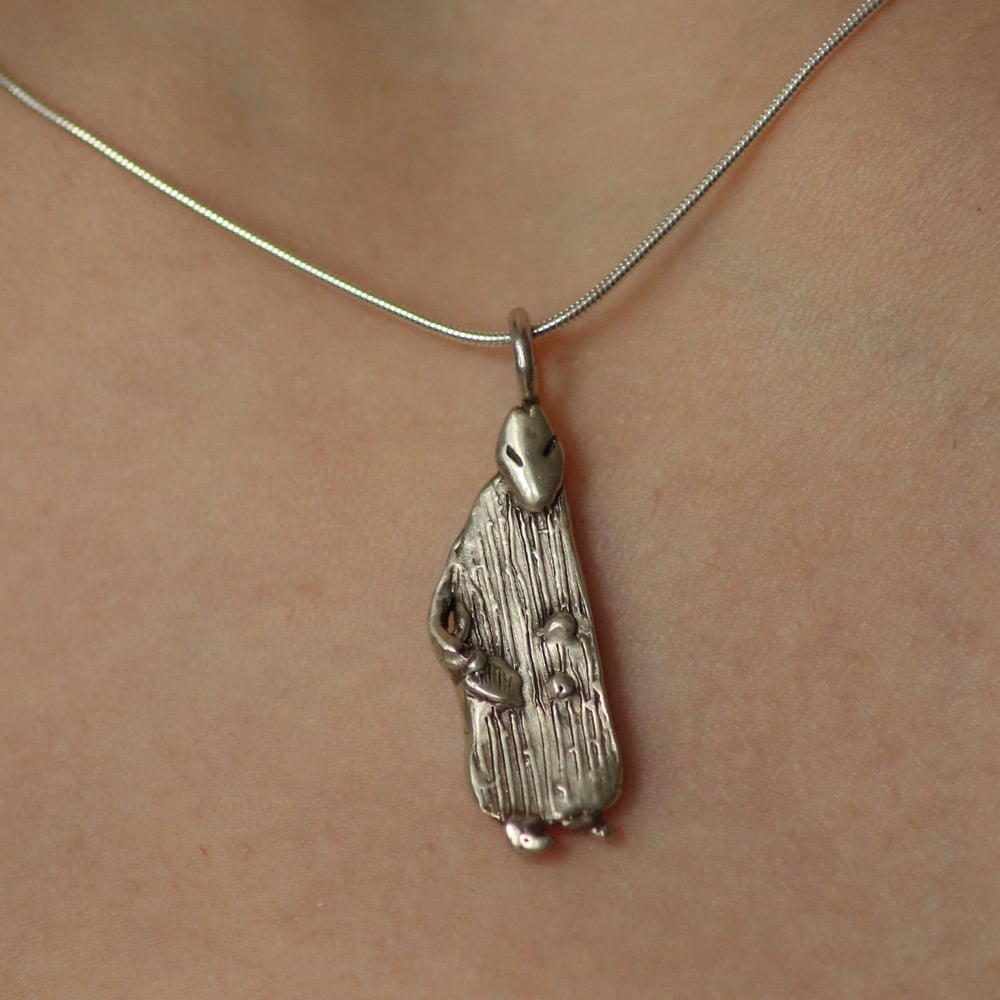 The kind of statement necklace that is so small it makes its statement by someone wondering for a while what it is around your neck and when they eventually ask you can proudly say “it’s an alien in a trench coat…” like it’s the most normal thing ever. Cause why isn’t it? I don’t know if anyone else in the world will have an alien in a trench coat around their neck. This is a one off, hand carved piece. Details brought out with patination.